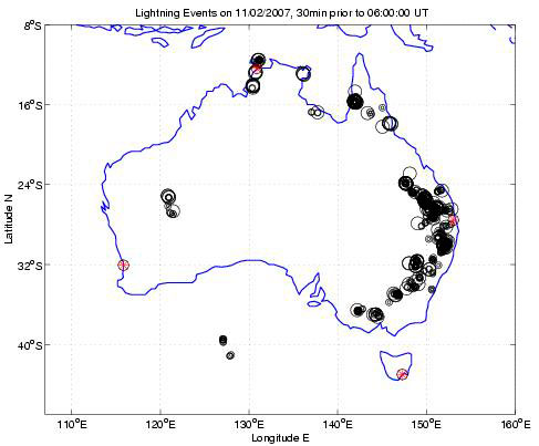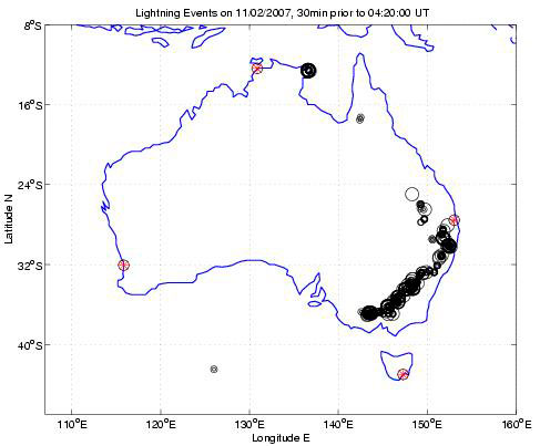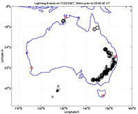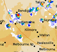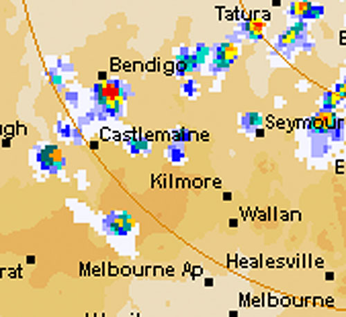 The satellite image below shows the multicell line through Castlemaine to Kilmore at approximately 4:30pm. The Lightning Tracker shows images from approximately 2:50pm, 3:30pm and 4:30pm respectively. Thanks to Strike One.
