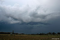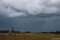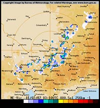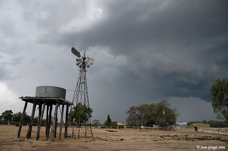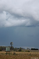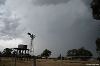 At 4:20pm we took a right turn at Longlea and stopped near a farm to photograph the cell as it drew closer. A great opportunity presented itself with the windmill and tank, but unfortunately due to the increasing spitting rain and closer proximity of lightning, we made a hasty retreat. There were certainly some interesting outflow features of this storm, and a slight teal colour in the clouds too. As the core reached us whilst driving the rain wasn't as heavy as we had imagined it would be, and we didn't hear any hail. The radar image, courtesy of BoM and Strike One, is taken at 4:26pm and shows a small multicell line beginning to form and the 2 separate cores we had seen.