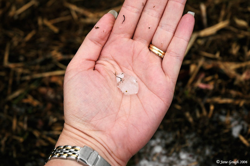 We turned off the FWY to the East and drove down Sheltons Road in the Spring Gully region. We encountered a fair amount of fresh leaf litter on the road and eventually pulled over at 3:30pm to find hail drifts. Looking around we discovered some stones, measuring just under 2cm. Considering the cell went through the area at approximately 2:16pm (according to the radar) , it is possible these stones could have been larger. As we were walking along the side of the road, distant rumbles from the next approaching cell could be heard, as well as some weak mammatus forming overhead. A good sign of things to come! The radar frame below is courtesy of the BoM and Strike One. It shows the 'Bendigo hailer' in approximately the position we were when we discovered the hail drifts, and also at it's most intense returns.