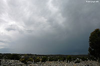 My chase partner and I began our journey from the SE Suburbs in clear skies at 1pm, and headed roughly North West towards the Central Ranges along the Hume HWY. We could see upon leaving development already towards the North. As we drove through Wallan, we stopped to photograph the back end of a cell which was passing over the Riddells Creek towards Macedon area. We took the Northern HWY towards Kilmore and also photographed it behind some farm building ruins!
