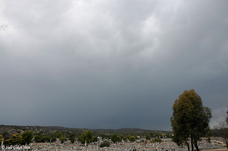 Finding a vantage point in Bendigo was certainly a challenge, and we didn't want to get too far away from the rumbling cell that was to the SE of us. We knew there wasn't a good viewing spot down the Calder to the South, so we drove to the east, and came across a great spot in Flora Hill overlooking the cemetery at 3.55pm. Mammatus was still trying to form overhead, and distant rumbles could be heard, although we didn't observe any lightning at this stage.
