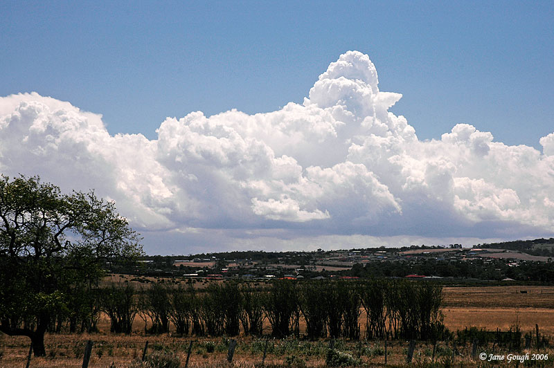We had turned off the Northern HWY at Kilmore and traveled towards the Calder FWY via Lancefield. At 2:10pm we noticed through trees and hills that the back end of the original Riddells Creek/Macedon cell had literally put up some explosive updrafts. It was an amazing sight, but due to the local topography and foliage, it made viewing the base of the updrafts a little tricky! It didn't last terribly long however, and 15 minutes later all that was left of it was some fibrous anvil!